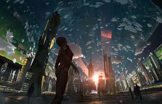 |caption9=A human cyborg observes the curving landscape of the Fhirhami O'Neill Cylinder. | |||