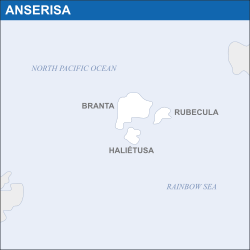 Anserisa is located in the [[Rainbow Islands (Pacifica)|Rainbow Islands]], on the western side. It is composed of three islands, Branta, Haliétusa and Rubecula with smaller islands surrounding the main islands. The highest peak is Mount Canadensiso at 1,515 meters (4,970 feet) located on Branta Island. | Anserisa is located in the [[Rainbow Islands (Pacifica)|Rainbow Islands]], on the western side. It is composed of three islands, Branta, Haliétusa and Rubecula with smaller islands surrounding the main islands. The highest peak is Mount Canadensiso at 1,515 meters (4,970 feet) located on Branta Island. | ||