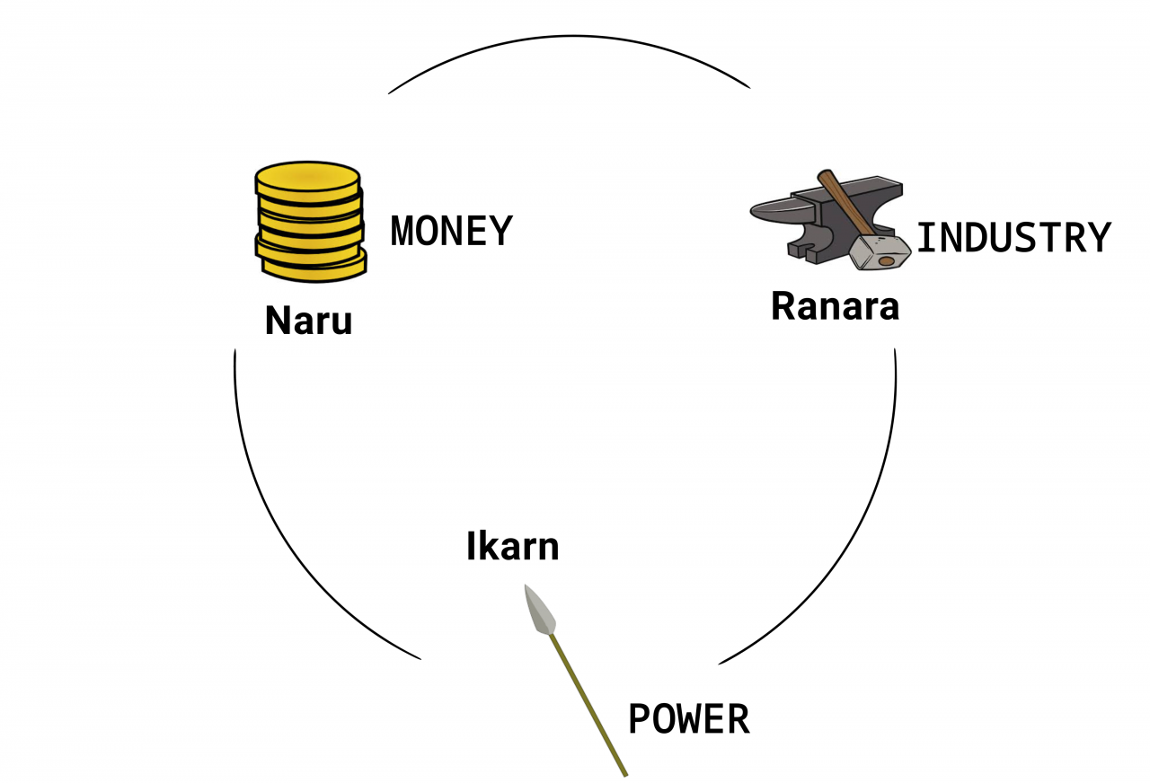 A depiction of the power cycle between the old Ikaranarean tribes
