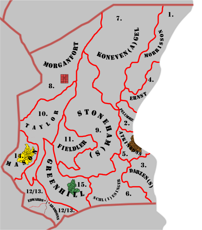 Map of Nasphilitae with borders of each Peer House Thanes' with numbers showcasing each Peer House arrival. Dispute over Thane(s) of Peer Edwards and Adamsons is showcased in respective claims of territory. Caused by (12./13.) disputed time of arrival and lack of standardised measurement determining how "North from the Mounts Peak" would look like drawn on a 2D surface.