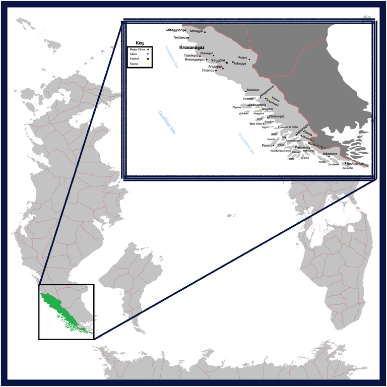 A map of Pacifica with a callout of Krauanagazan cities and towns