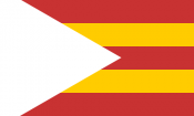 The war flag of Transsuneria, which also is the naval ensign, is used by the Transsunerian Defence Forces. It has five equal horizontal stripes, alternating red and yellow, with a white chevron aligned to the hoist-side. The flag was inspired by the flag of Sedunn.